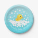Pato adorável cercado por bolhas sobre fundo azul para um chá de fraldas neutro. Sacudir nosso doce design para ver um pato coordenador de volta para um toque especial extra. Visite nosso compro para exibir itens de chá correspondentes.