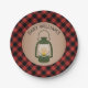 Placas de papel do chá de fraldas que caracterizam uma ilustração de uma lanterna de acampamento verde com um fundo vermelho e preto da xadrez do lenhador.