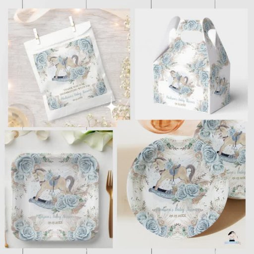 Personalize essas placas de papel que combinam de forma fácil e rápida, basta pressionar o botão personalizar para reorganizar e formatar o estilo e a colocação do texto. Apresentando um cavalo balançador branco de madeira vintage, rosas azuis bonito e capim de pampas de tons de terra. Excelente para chá de fraldas, novo bebê, festa de aniversário e mais ocasiões! Itens correspondentes disponíveis no repositório! c) O Feliz Cat Studio