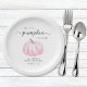 Chapas de papel bonitas para o chá de sua menina apresentando "A Sweet Little Pumpkin Is On Her Way" em uma simples tipografia de cinza, e uma aquarela cor-de-rosa pastel de uma abóbora.