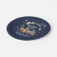 Placas de papel de chá de fraldas, de inverno, russas, com ilustrações de cor d'água de animais de floresta giros (cervo, raposa, urso e coruja), flores, estrelas de verde e ouro e flocos de neve. "Aguardam" e o nome da futura mãe está em um roteiro branco contra um fundo azul escuro.