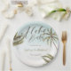 Lindo pratos de chá de fraldas com tema de praia. O design apresenta as nossas palmeiras pintadas à mão, palmeiras, céu azul e plano de fundo cinza de praia. Nossas placas de chá de fraldas boho tropical Aloha são perfeitas para uma festa de chá de fraldas na praia. Design e trabalho de arte pintado à mão por Moodthogy Papery.
