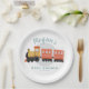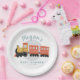 Este design de placa de papel chá de fraldas giro, caprichoso e moderno apresenta um desenho animado de viagem de trem e pode ser personalizado com o(s) nome(s) dos pais/mãe e a data do seu partido. O transporte perfeito temia a adição ao chá de fraldas de seus casais.