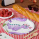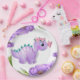 Espero que gostem deste dinossauro roxo giro cercado por flores roxas e uma borboleta rosa no nariz dela. Os produtos correspondentes estão disponíveis.