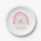 Placa de papel de chá de fraldas com tema do arco-íris, bonita e moderna, com ilustração desenhada à mão de um arco-íris pastel com estrelas. Este design cor-de-rosa é perfeito para o chá de uma menina.
