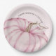 Uma grande abóbora rosa destaca essas lindas placas de papel de chá de fraldas de menina com as palavras "Uma abóbora está a caminho" guardadas em volta do topo. (Disponível em azul, branco e menta, também.) CORRESPONDENDO a itens na nossa loja.