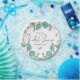 Chá de panela de Data do Nome do Script Eucalyptus Azul. A folhagem azul-lacrimejante borda as bordas com nome e data no meio, que você pode personalizar facilmente, e um moderno script manual set para o chá de panela.