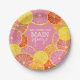 Frutas cítricas caprichosas em tons de rosa, coral, laranja e toranja vermelha rubi. As fatias de cítricos desenhadas à mão incluem uma textura pintada à aquarela para uma adição suculenta a um prato de papel colorido para chá de casamento.