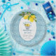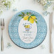 Um design elegante de chá de panela com fundo de azulejo azul e um copo de limões.