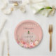 Chá os convidados no chá de fraldas com esta elegante e floral abóbora está no caminho dos designs. Abóbora-rosa embebida em flores cor-de-rosa, corais e amarelas por baixo, fita-rosa e luzes de cordas por cima sobre um fundo rosa-claro.