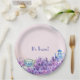 Uma bela placa de papel com fundo de pínus, flores roxas, xícara de chá azul e pote de chá. Perfeito para celebrar uma futura mãe gêmea. O texto é personalizável. Seus convidados chás de fraldas vão adorar comer esses pratos coloridos!
