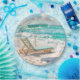 Uma cena de praia serena apresenta uma cadeira de salão e um guarda-chuva listrados contra um pano de fundo de ondas turquesas e nuvens brancas lisas