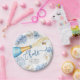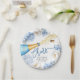 Celebre com estilo cintilante com este prato de papel para chá de noiva "Cheers" apresentando uma explosão de bolhas de uma garrafa de champanhe azul em aquarela, rodeada por flores brancas suaves e azuis empoeiradas. Elegante, mas divertido, é o complemento perfeito para o tema de chá de noiva "Algo Azul". Personalize com o nome da noiva e a data do chá para criar um detalhe de festa coeso e memorável que os convidados vão adorar.