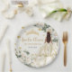 Estas placas de papel de coordenação apresentam rosas brancas de marfim encantadoras, uma menina vestida com um belo vestido de marfim de champanhe, e borboletas de ouro floreadas. Personalize-o com seus detalhes de forma fácil e rápida, basta pressionar o botão personalizar para reorganizar e formatar o estilo e a colocação do texto. c) O Feliz Cat Studio