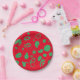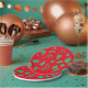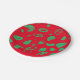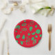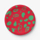 Esta placa de papel festivo apresenta linhas curvas e formas em verde sobre uma superfície vermelha.