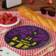 Placas de festas de papel para o Halloween com imagem de morcegos contra um céu roxo e uma casa assombrada com aranhas assustadoras, gatos e outras surpresas assustadoras.