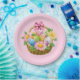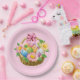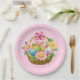 A placa de papel de festas é mostrada em rosa com um impressão de cesto de Páscoa bonito. Personalize este item ou comprar como está. Mostrado no tamanho de 9". Vendido em embalagens de oito.