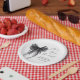 Pratos de papel elegantes para o seu chá de noiva, apresentando uma aquarela elegante de um laço coquete preto, "Ela está dando o nó" em uma fonte caligráfica, e o nome da noiva e a data do chá em letras modernas simples.