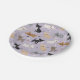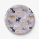 Cute chihuahua dogs in black, brown, tan, cream, gray and blue coats sit and stand scattered dog bones and paw prints on a light purple background.