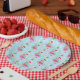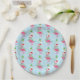 Pink Christmas flamingos wearing string lights and a Santa hat on a pastel blue background with snowflakes and festively decorated palm trees. Shown here on customizable paper party plates. You can easily resize the pattern to your preference and select your favorite background color. It's a cute pattern for celebrating Christmas with a tropical vibe!