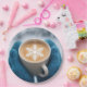 A steaming cup of coffee, decorated with a snowflake design in the froth, held in blue knitted mittens against a snowy backdrop