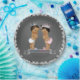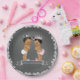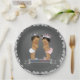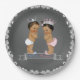 Pratos de papel para chuva de bebê revelação de gênero com bebês étnicos príncipe e princesa usando coroas douradas bonitas em um redemoinho de giz e fundo de faixa de giz. Você pode adicionar texto para personalizar e pode alterar o texto na faixa.