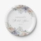 Pratos de papel para chuva de noiva florais de jardim azul empoeirado em aquarela elegante. Estilo de design de tipografia cinza elegante com imagem gráfica de caligrafia "Chuva de Noiva".
