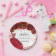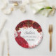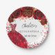 Para uma Quinceañera, 15 festa de aniversário. Um fundo branco com confete vermelho, um vestido e rosas vermelhas, florais. O nome é escrito com um moderno estilo escrito à mão. Personalize e adicione seu nome e uma data.