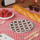 PLACAS DE PARTIDO DE PAPEL CIRCULAR REINDICADAS - Um padrão de fundo alopado de círculos sobrepostos, aparados com costura digital. Os círculos são criados peça a peça em pétalas em forma de folha de quatro que criam um círculo acabado. Dentro, o círculo é uma forma de diamante irregular também aparada na costura. A rena reluzente se senta dentro no círculo em cima da forma de diamante. Uma pequena borda de colly e bagas fica sobre os círculos, coçando. Entre os círculos está o espaço vazio aparecendo como outra forma irregular de diamante. Este espaço poderia ser simples ou cheio de um elemento de Natal como flocos de neve ou holly. Este design está disponível em cores variadas. Escolha qualquer tamanho de placas de papel Zazzle. Está disponível a coordenação de presentes e suprimentos de partidos Zazzle.