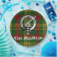 Crachá da crest escocesa Clan MacMillan e texto sobre fundo tartano