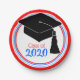Use estas Formandos 2024, Boné Vermelho, Branco e Placas Azuis, para servir comida aos seus convidados. Personalize com seu ano de classe de formando. Ele apresenta um boné de formando com 'Classe de 2024' em um script na moda vermelho e azul.