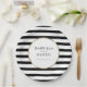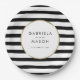 Com um clássico fundo listrado preto e branco, estes elegantes pratos de papel para casamento apresentam uma borda elegante em folha de ouro falso emoldurando seus nomes e data especial em tipografia sofisticada. Projetado por Thisisnotme