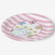 Placas de papel com fundo listrado rosa e branco. Um quadro circular branco com uma borda cor-de-rosa colocada sobre a parte superior. Dentro na moldura uma ilustração de uma mãe e um coelhinho de bebê juntos. Águas amarelas no fundo. Borboletas brancas se espalhando.