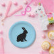 Esta placa de papel é azul claro com um coelho coelho feito em silhueta preta numa posição sentada. Excelente de estilo minimalista para comemorações de Páscoa ou primavera.