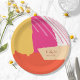 Abstract color blocking in a bold color palette of hot pink, tangerine orange and golden yellow provides a striking background for the pieces in this contemporary wedding suite. The paper plate shown here is perfect for adding a bold, modern touch to your wedding table decor. Use the provided template to add your initials and wedding date. Search ID740 to see other color options and additional products with this modern design.