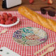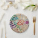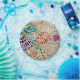 Ele apresenta uma impressão de um mosaico original inspirado na praia feito de vidro, seixos e conchas.