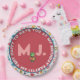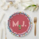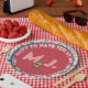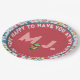 Um design de prato bonito para o evento dos seus filhos. Esta placa oferece uma mensagem personalizável e uma seção personalizável de "iniciais". Ele fornece um design de desenhos tipo lápis de cor e flores em um fundo vermelho.