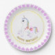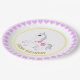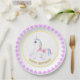 Placa de papel com corações violetas bonitos e um unicórnio de aniversário fofo no centro. O texto "Parabéns" pode ser personalizado,