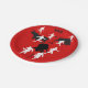 Design moderno que mostra os corredores brancos, na silhueta, funcionando com os touros pretos grandes mostrados em silhueta contra um fundo vermelho.
