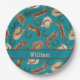 Aproveite um evento ou festa temática ocidental ou rodeada. Estas placas de papel apresentam um design de botas de vaqueiro ou de vaqueira ocidental e chapéus com sapatos de cavalo em castanho e bronzeados sobre um fundo azul de turquesa. Um bar de tarte turquesa com bordas marrons na placa dá um espaço para personalização com um nome, nome de empresa ou nome de evento para torná-lo seu. Fácil de personalizar e personalizar. Excelente para cowboys ou cowboys! Adicione guardanapos coordenadores. Outros produtos e cores de fundo estão disponíveis para um tema ocidental.