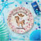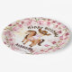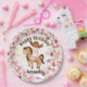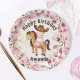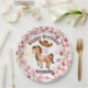 Bela vaquinha sela pratos de festas personalizadas. Cowgirl cavalgando um cavalo bebê fofo e flores rosa. Cores de fazenda castanho e amarelo-rosa.