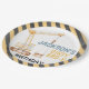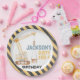 Crane Construction Dirty 3rdy Birthday Plate Construction tematizou a placa de papel 3rdy Birthday, com uma grua e padrões amarelos e negros listrados.