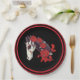 Placas de papel com crânio de cavalo decorado com rosas vermelhas e cestaria vermelha. Perfeito para Los dias de los Muertos, Halloween, ou qualquer reunião assustadora.