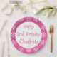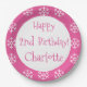 Placas de papel de Festa de aniversário de inverno em floco de neve, cor-de-rosa personalizado. Um plano de fundo de flocos de neve rosa e branco divertido. O círculo branco com bonito fonte rosa diz Feliz Aniversário. Personalize com idade e nome. Suprimentos de festa de aniversário rosa bonito e adoráveis para uma festa de aniversário de inverno para meninas.