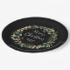 Estas placas de papel de feriado simples e na moda apresentam uma coroa de aquarela impressionante com folhas de ouro verdes e sujas e groselhas vermelhas, e uma tipografia moderna branca que diz "Feliz Natal" num fundo preto escuro.