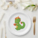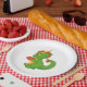 Adorable green baby dragon with red spikes and golden horns is holding a red teacup.