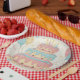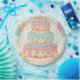 An ultra-sweet and festive design illustrated in the Japanese Kawaii style. The pattern features a smiling three-tier birthday cake with candles, surrounded by balloons, small cupcakes, and stars. The color palette is soft and pastel (pink, blue, and light blue), creating a joyful and childlike atmosphere. This design is perfect for party supplies, greeting cards, children's packaging, and any item meant for a birthday celebration.