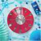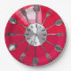 Hora da comida! Uma face vermelha e rosa do relógio feita de colheres e garfos. Que excelente é isso para um incrível prato jante! Veja a imagem da irmã azul 'Cutlery O'clock.'