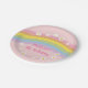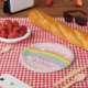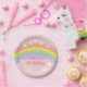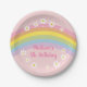Estas pratos de papel de aniversário bonitinhos apresentam margaridas desenhadas à mão e um arco-íris em cores pastéis.