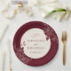 Serve sweet bites on paper plates rimmed in deep burgundy with blooming florals and an ivory center for your names or monogram. The moody palette turns even casual tableware into part of your décor. Coordinates with other products from the wedding suite.